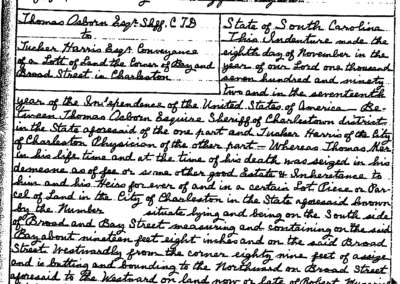 This well known property at the southwest corner of East Bay Street and Broad Street is best known as the State Bank of South Carolina. The original grant was to Jacob Waite in 1680 but then regranted to Benjamin Schenckingh in 1696. By 1723 there was a brick dwelling house with adjoining brick storehouses.