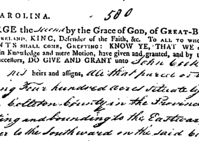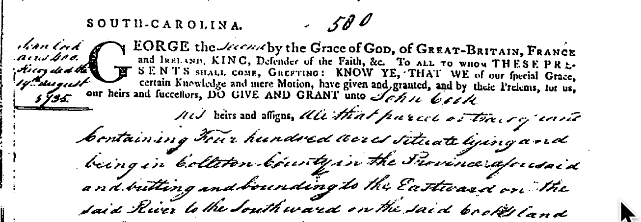 Located in present-day Colleton County this beautiful Edisto river plantation was granted in 1735 by King George II to John Cook. This property extended to the river called Pon Pon at that time including the marsh. Multiple marriage settlements entangled the ownership throughout most of the 19th century.